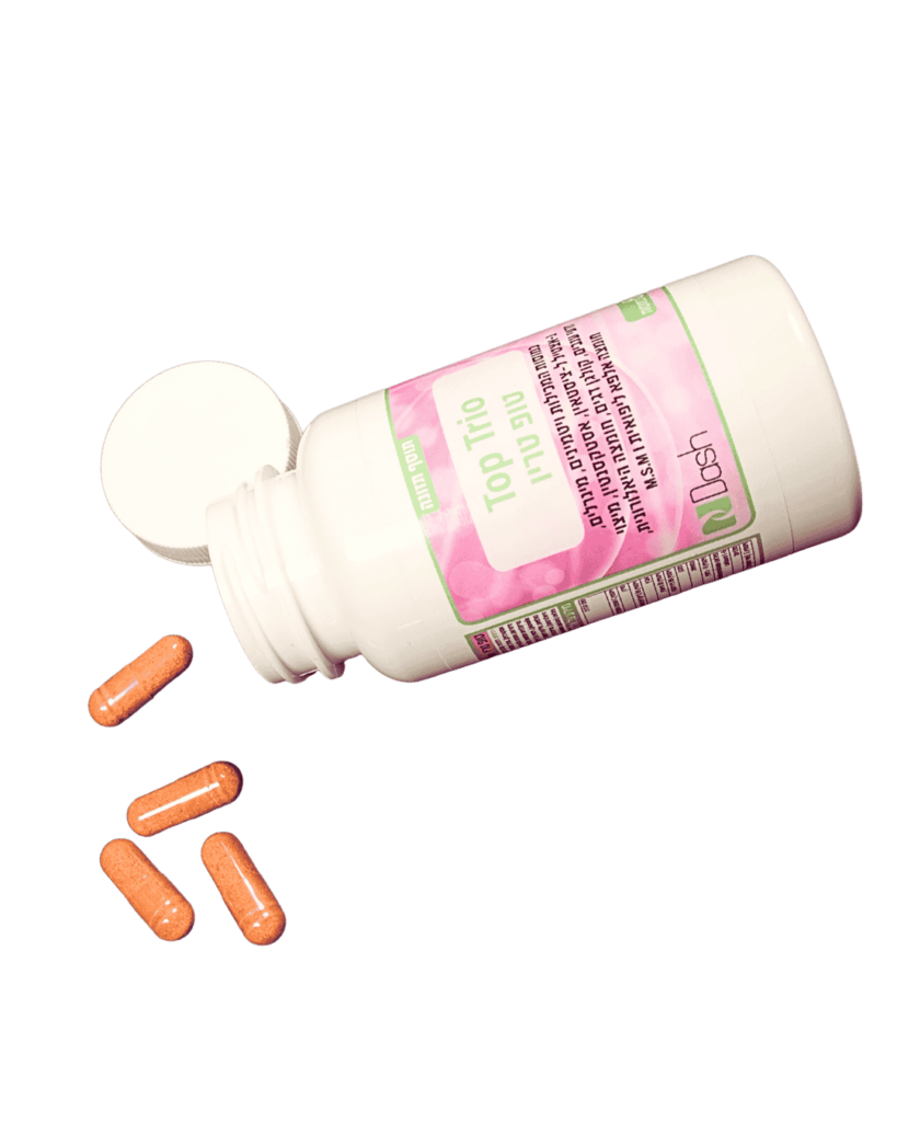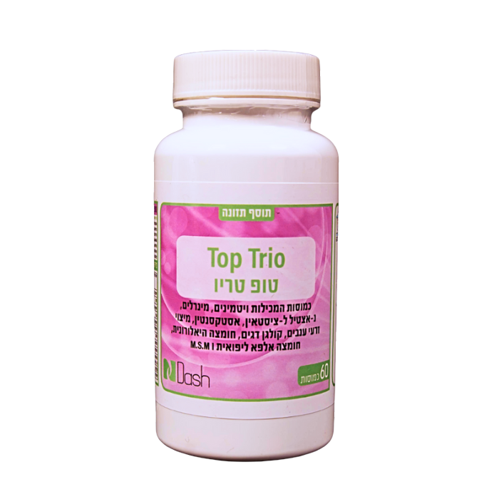 TOP TRIO טופ טריו תוסף תזונה טבעי בעל 3 פעולות משמעותיות ועוצמתיות: משקם ומחזק את זקיקי השיער ומסייע לעצירת הנשירה. משפר את מראה עור הפנים. מונע פיצול ושבירה של הציפורניים ומחזק אותם.